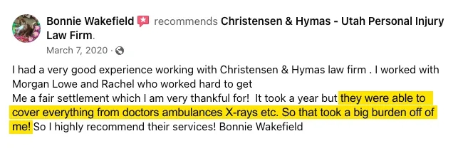 If the car you were in was insured then you may be eligible for No-Fault insurance or PIP (Personal Injury Protection) benefits. Almost every Utah car insurance policy has at least $3,000 available for medical bills, no matter who was at fault in causing the accident. At Christensen & Hymas we can usually help you obtain these benefits and others at no charge.